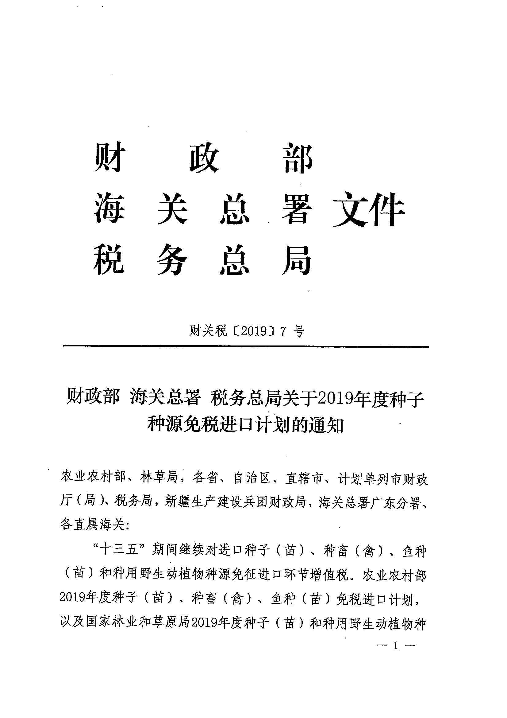 财政部 海关总署 税务总局关于2019年度种子种源免税进口计划的通知