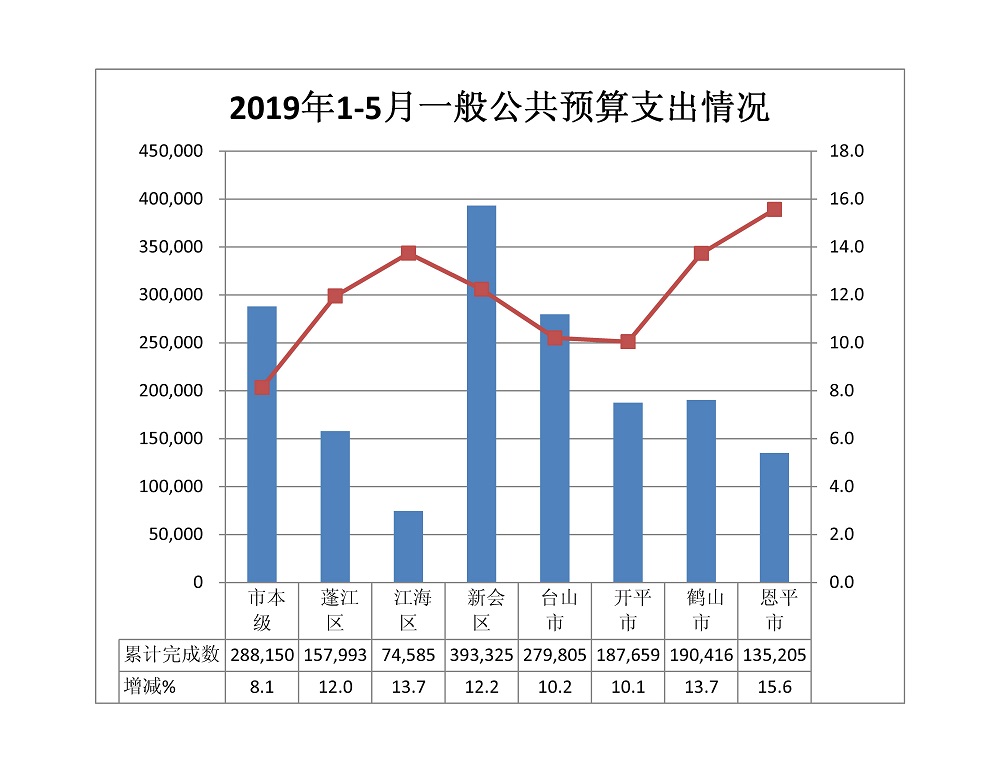 1-5月,全市一般公共预算支出完成170.71亿元,同比增长11.4%。市本级完成28.82亿元,增长8.1%。各市(区)完成情况:蓬江15.8亿元,增长12%;江海7.46亿元,增长13.7%;新会39.33亿元,增长12.2%;台山27.98亿元,增长10.2%;开平18.77亿元,增长10.1%;鹤山19.04亿元,增长13.7%;恩平13.52亿元,增长15.6%。