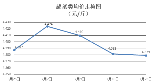 据本市21家农贸市场监测数据显示,上周(7月17日至7月23日,下同)市场上各类“菜篮子”商品供应充足,所监测的7大类“菜篮子”商品价格5跌2平。其中:粮食类、水果类商品价格基本平稳,食用油类、肉禽蛋类、蔬菜类、水产类商品价格总体略降。受高温天气影响,预计近期部分肉禽类商品需求减少价格下降,其他商品价格小幅波动。