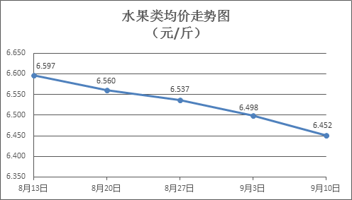 水果类商品价格总体略降。上周所监测的6种水果商品价格波动情况为2涨4跌,综合零售均价为6.452元/斤,环比下降072%。其中苹果、香蕉、葡萄零售均价分别为每斤7.30元、3.05元、13.00元,环比分别下降0.14%、下降0.33%、下降1.52%。