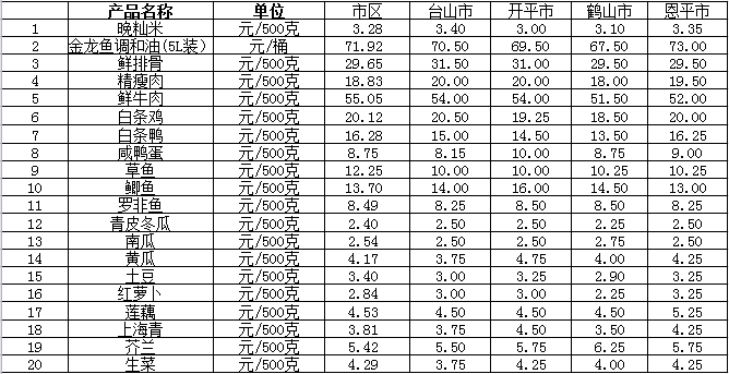说明:1、表中价格为该地区监测点综合平均价;2、“市区”含蓬江区、江海区、新会区,价格分别采自蓬江市场、江南市场、城东市场等13家农贸市场;3、其他四个县市价格分别采自新华市场、锦江市场等8家农贸市场。
