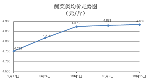 蔬菜类商品价格升降互现。上周所监测的32 种蔬菜商品价格波动情况为15涨14跌3平,综合零售均价为4.886元/斤,环比上涨0.10%。其中:涨幅居前的品种包括黄瓜、青豆角、西洋菜,零售均价分别为每斤4.17元、5.35元、6.65元,环比分别上涨2.71%、1.71%、1.68%;跌幅居前的品种为苦瓜、水空心菜、大白菜,零售均价为每斤5.37元、4.56元、3.08元,环比分别下降2.01%、1.94%、1.91%。