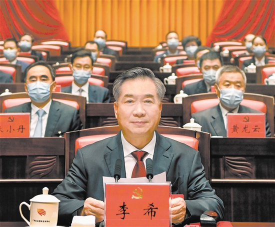 李希指出,这次大会严格贯彻落实党中央对换届工作的部署要求,在中央组织部督导组的指导和支持下,广泛酝酿讨论,充分发扬民主,顺利完成了选举任务。我们要牢记初心使命,不负厚望重托,团结带领全省广大党员干部朝着习近平总书记指引的方向奋勇前进,努力跑出我们这一棒的高质量,向习近平总书记、党中央,向全省父老乡亲交出合格答卷。