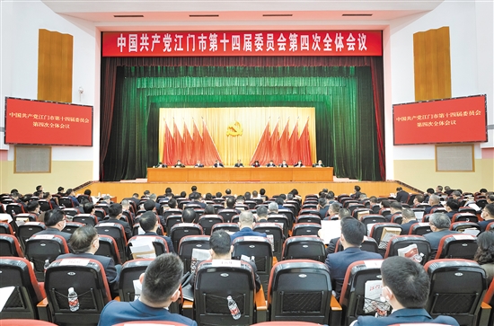 江门日报讯 (记者/唐达 通讯员/莫小青) 2月6日,中共江门市委十四届四次全会召开。会议以习近平新时代中国特色社会主义思想为指导,深入学习贯彻党的二十大精神和中央经济工作会议精神,认真贯彻落实省委十三届二次全会、省“两会”、省委经济工作会议和全省高质量发展大会部署要求,总结2022年工作,研究部署高水平推进江门高质量发展,动员全市上下守正创新、团结奋斗,全面打造物质文明和精神文明相协调的现代化综合实践区,努力实现江门在高质量发展新征程中走在全省前列。市委书记陈岸明代表市委常委会作报告。