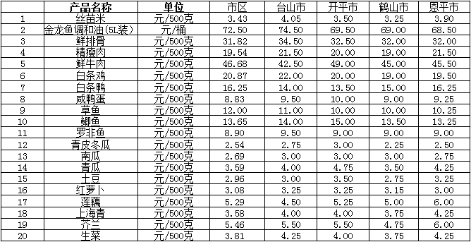 说明:1、表中价格为该地区监测点综合平均价;2、“市区”含蓬江区、江海区、新会区,价格分别采自蓬江市场、江南市场、城东市场等13家农贸市场;3、其他四个县市价格分别采自新华市场、锦江市场等8家农贸市场。