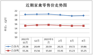 本月白条鸡、白条鸭零售均价分别为每斤19.86元、15.25元,环比分别上涨0.71%、上涨0.13%,同比分别上涨3.87%、上涨6.87%;白壳鸡蛋、鸭蛋零售均价分别为每斤6.92元、7.81元,环比分别下降0.86%、上涨0.13%,同比分别上涨10.37%、上涨10.31%。