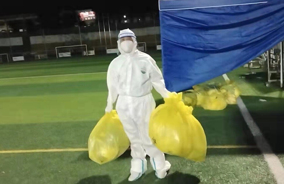 夜晚的球场,收运人员正为赢得与疫情的赛跑而奋战