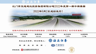 9月2日,江门市交通建设投资集团有限公司(下称“市交建集团”)2022年度第一期中期票据成功发行,本次发行金额6亿元,期限3年,发行利率2.89%,认购倍数达5.37倍,创国内非金融企业历史以来同评级同期限债券(不限品种和发行方式)发行利率新低,体现了资本市场对市交建集团发展前景的认可。