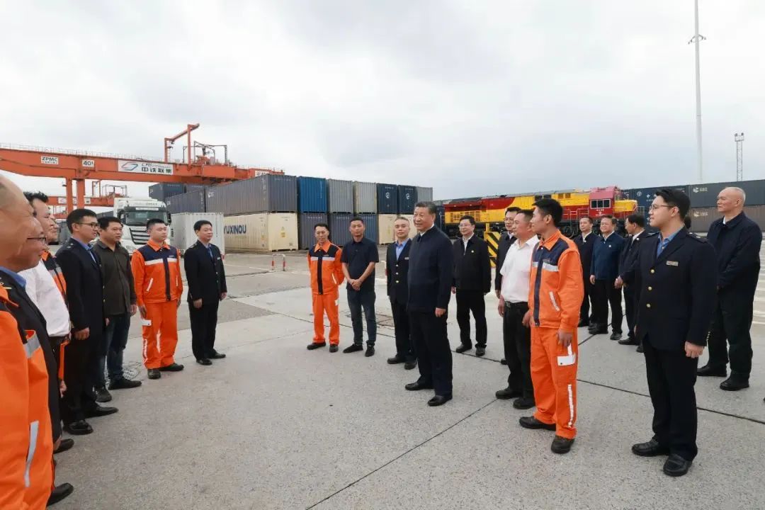 2024年4月22日,习近平总书记在重庆国际物流枢纽园区重庆铁路集装箱中心站,同货车司机、列车司机、装卸工人、场站管理人员等亲切交流。图片来源:新华社