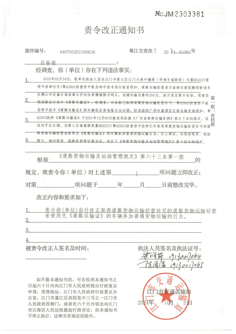 你(单位)因违反交通运输行政管理法规,本机关已作出行政处罚决定和责令改正通知书(具体内容详见附件)。依照《中华人民共和国民事诉讼法》第九十五条的规定,因受送达人采用其他方式无法送达,现向你(单位)公告送达《行政处罚决定书》和《责令改正通知书》。自公告之日起,经过30日即视为送达。