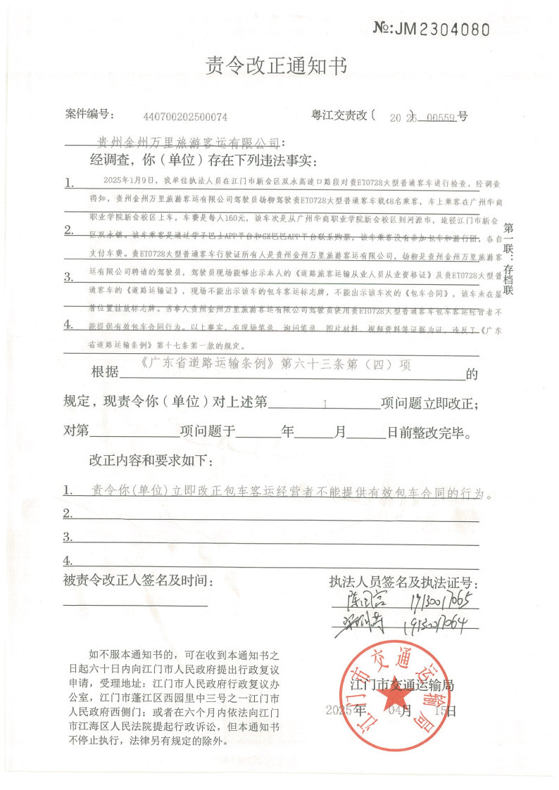 你(单位)因违反交通运输行政管理法规,本机关已作出行政处罚决定和责令改正通知书(具体内容详见附件)。依照《中华人民共和国民事诉讼法》第九十五条的规定,因受送达人采用其他方式无法送达,现向你(单位)公告送达《行政处罚决定书》和《责令改正通知书》。自公告之日起,经过30日即视为送达。
