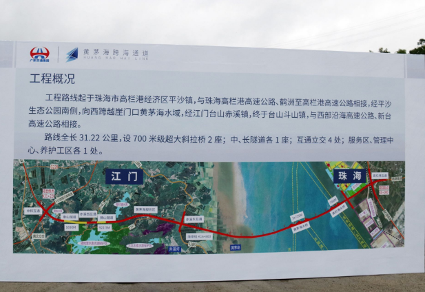 黄茅海跨海通道项目起于珠海市高栏港区,东连港珠澳大桥,西连新台高速并与西部沿海高速相交,止于台山市斗山镇。路线全长约31公里,采用双向6车道高速公路标准,设计时速100公里/小时,设计使用寿命100年。