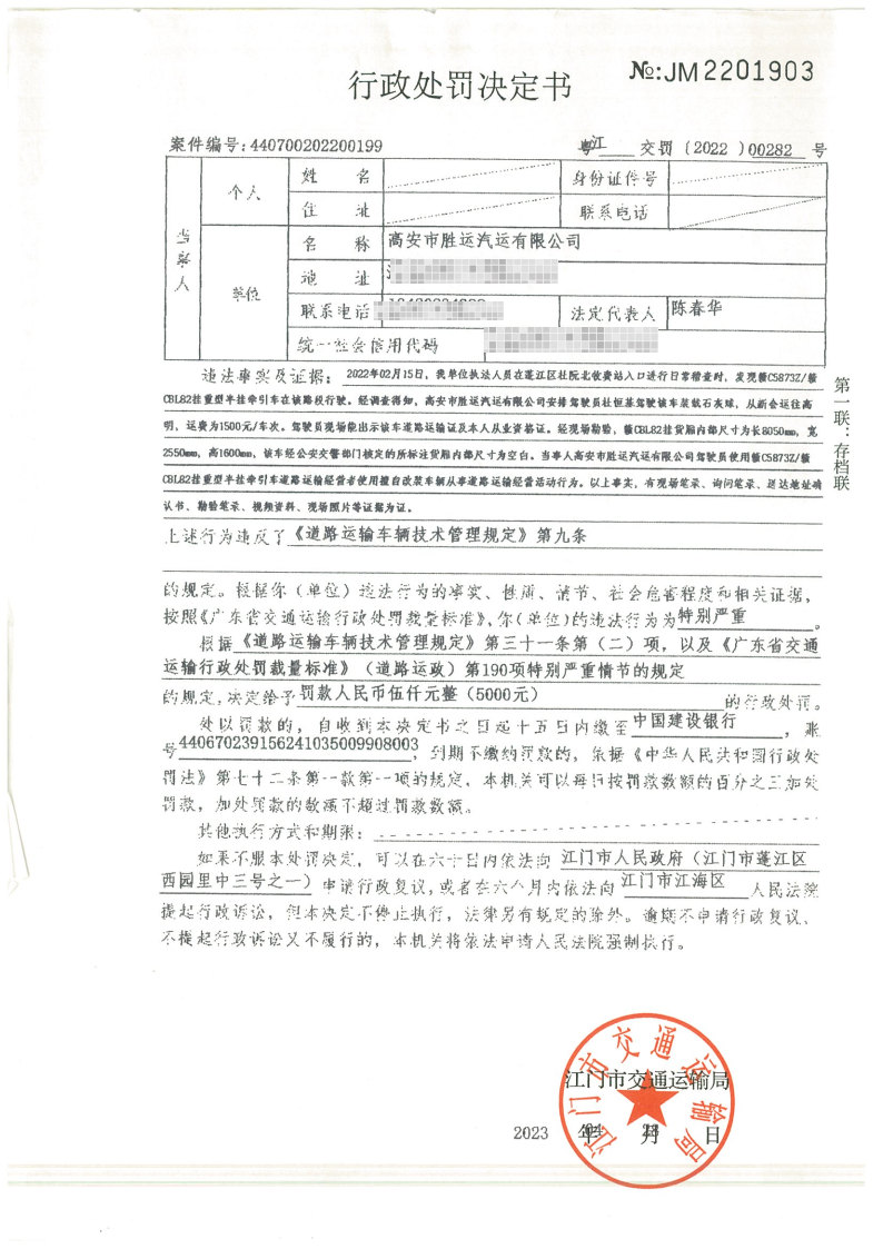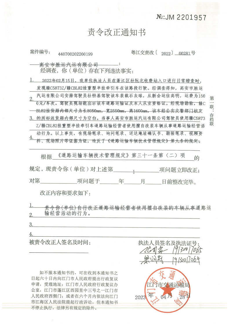 你(单位)因违反交通运输行政管理法规,本机关已作出行政处罚决定和责令改正通知书(具体内容详见附件)。依照《中华人民共和国民事诉讼法》第九十二条的规定,因受送达人采用其他方式无法送达,现向你(单位)公告送达《行政处罚决定书》和《责令改正通知书》。自公告之日起,经过30日即视为送达。