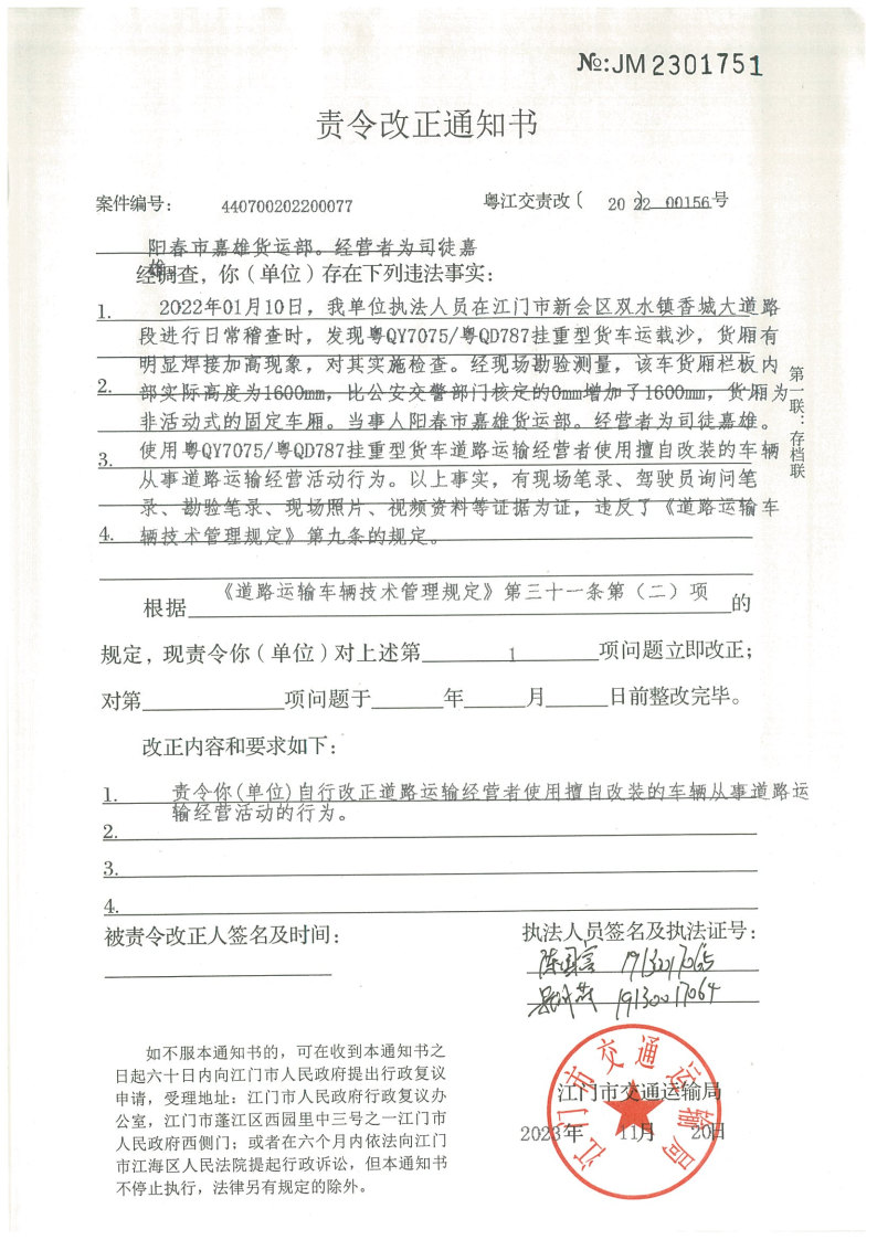 你(单位)因违反交通运输行政管理法规,本机关已作出行政处罚决定和责令改正通知书(具体内容详见附件)。依照《中华人民共和国民事诉讼法》第九十二条的规定,因受送达人采用其他方式无法送达,现向你(单位)公告送达《行政处罚决定书》和《责令改正通知书》。自公告之日起,经过30日即视为送达。