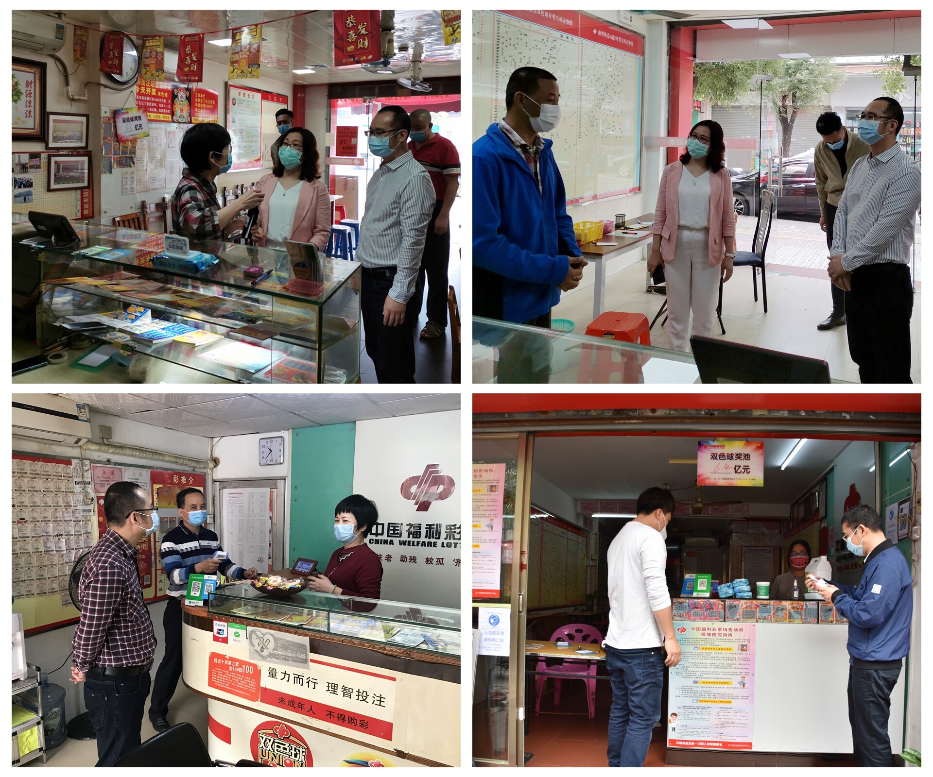 3月17日,江门市民政局副局长林雁冰同志、市福彩中心主任陈威雄同志和市场部工作人员一起走访了江海区3家投注站,检查指导站点防疫措施执行、调研复工销售情况。每到一处,雁冰同志带头认真检查了站点的疫情防控措施是否到位,聆听站点业主关于复工的声音和经营想法以及面临的实际困难,并查看消防应急器具。雁冰同志表示,全市福彩投注站的业主、销售员在疫情面前顾全大局,增强自我防护,当前没有出现一例新冠病毒感染,部分业主积极参与防疫志愿活动工作,切实履行福彩人应尽的社会责任。目前疫情还未过去,开市后,防控工作仍不可以松懈,必须严格落实《中国福利彩票销售场所疫情防控指南》和《广东省福利彩票系统新型冠状病毒感染的肺炎疫情防控工作指引》,保证各自站点责任田不出现纰漏,为国家打赢新冠肺炎疫情防控的人民战争、总体战、阻击战作贡献。防控疫情的同时,还要注意消防安全生产,要加强站点的电器设备、电线电路和消防设施的检测与维护,确保不产生消防安全隐患。