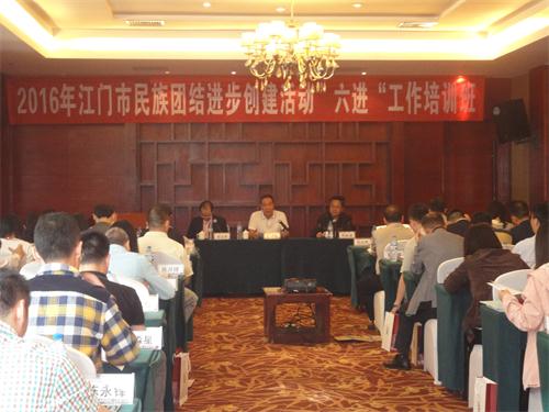 为深入开展江门市民族团结进步创建活动进机关事业单位、企业、社区(村)、镇(街道)、学校、宗教活动场所(以下简称“六进”)工作,5月16日至21日,江门市民族宗教局在全国民族团结进步创建活动示范地云南省昆明市举办江门市民族团结进步创建活动“六进”培训班。来自江门市直有关单位和蓬江区、江海区、新会区、台山市、开平市、鹤山市、恩平市民族团结进步创建示范单位有关负责同志共62人参加本次培训班。市委统战部副部长、市民族宗教局局长杜振飞出席培训班,并作开班动员。