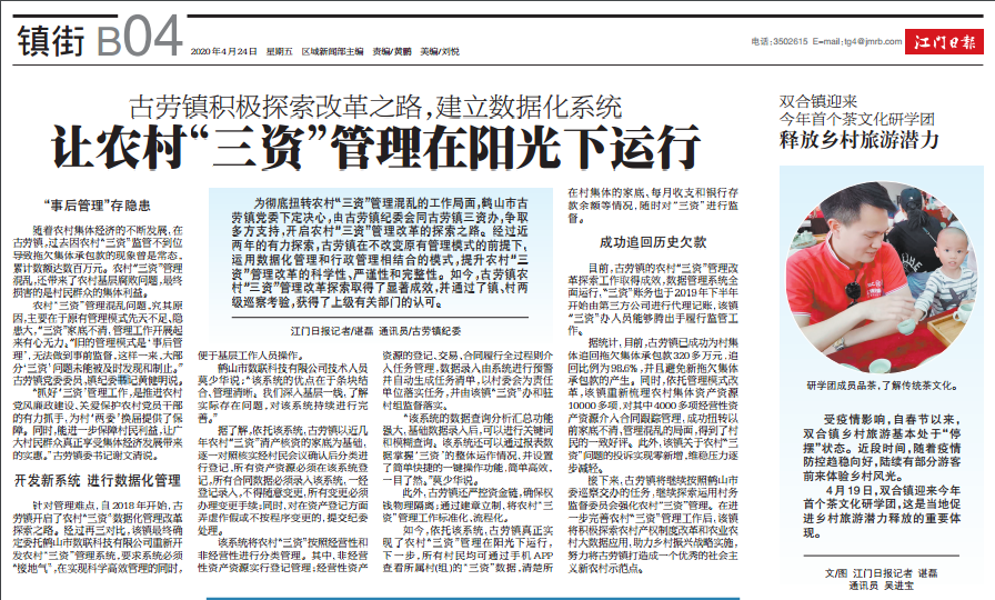 针对管理难点,自2018 年开始,我镇开启了农村“三资”数据化管理改革探索之路。经过再三对比,我镇最终确定委托鹤山市数联科技有限公司重新开发农村“三资”管理系统,要求系统必须 “接地气”,在实现科学高效管理的同时,便于基层工作人员操作。 鹤山市数联科技有限公司技术人员莫少华说:“该系统的优点在于条块结合、管理清晰。我们深入基层一线,了解实际存在问题,对该系统持续进行完善。” 据了解,依托该系统,我镇以近几年农村“三资”清产核资的家底为基础,逐一对照核实经村民会议确认后分类进行登记,所有资产资源必须在该系统登记,所有合同数据必须录入该系统,一经登记录入,不得随意变更,所有变更必须办理变更手续;同时,对在资产登记方面弄虚作假或不按程序变更的,提交纪委处理。 该系统将农村“三资”按照经营性和非经营性进行分类管理。其中,非经营性资产资源实行登记管理;经营性资产资源的登记、交易、合同履行全过程则介入任务管理,数据录入由系统进行预警并自动生成任务清单,以村委会为责任单位落实任务,并由该镇“三资”办和驻村组监督落实。 “该系统的数据查询分析汇总功能强大,基础数据录入后,可以进行关键词和模糊查询。该系统还可以通过报表数据掌握‘三资’的整体运作情况,并设置了简单快捷的一键操作功能,简单高效,一目了然。”莫少华说。 此外,我镇还严控资金链,确保权钱物理隔离;通过建章立制,将农村“三资”管理工作标准化、流程化。 如今,依托该系统,我镇真正实现了农村“三资”管理在阳光下运行,下一步,所有村民均可通过手机 APP 查看所属村(组)的“三资”数据,清楚所在村集体的家底、每月收支和银行存款余额等情况,随时对“三资”进行监督。 3 成功追回历史欠款