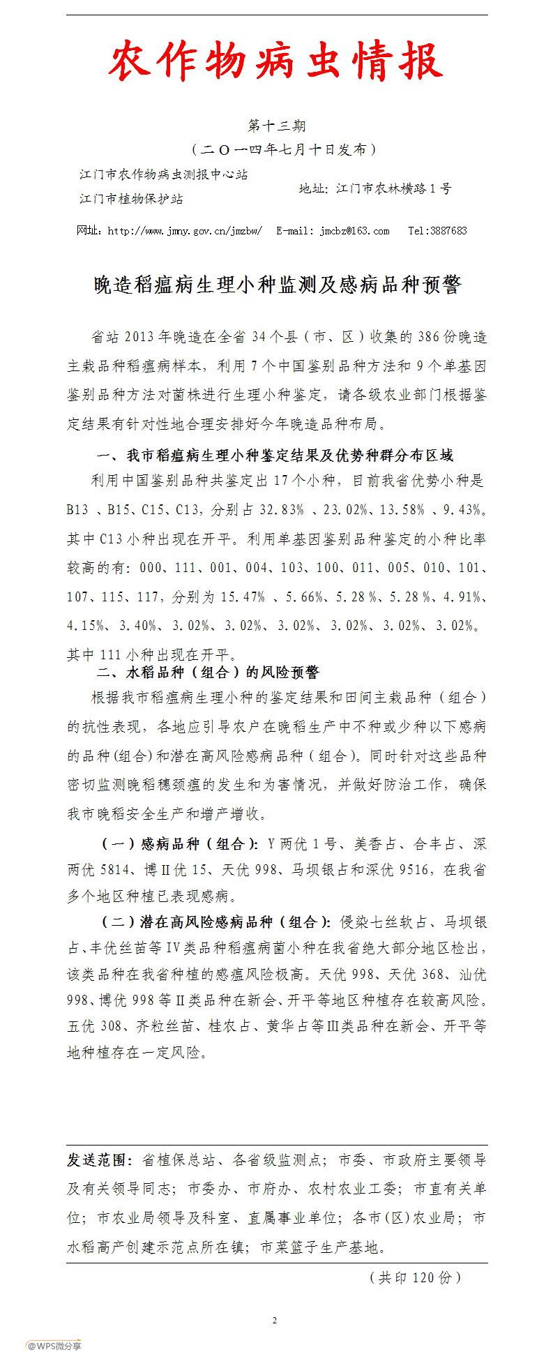 (晚造稻瘟病生理小种监测及感病品种预警)