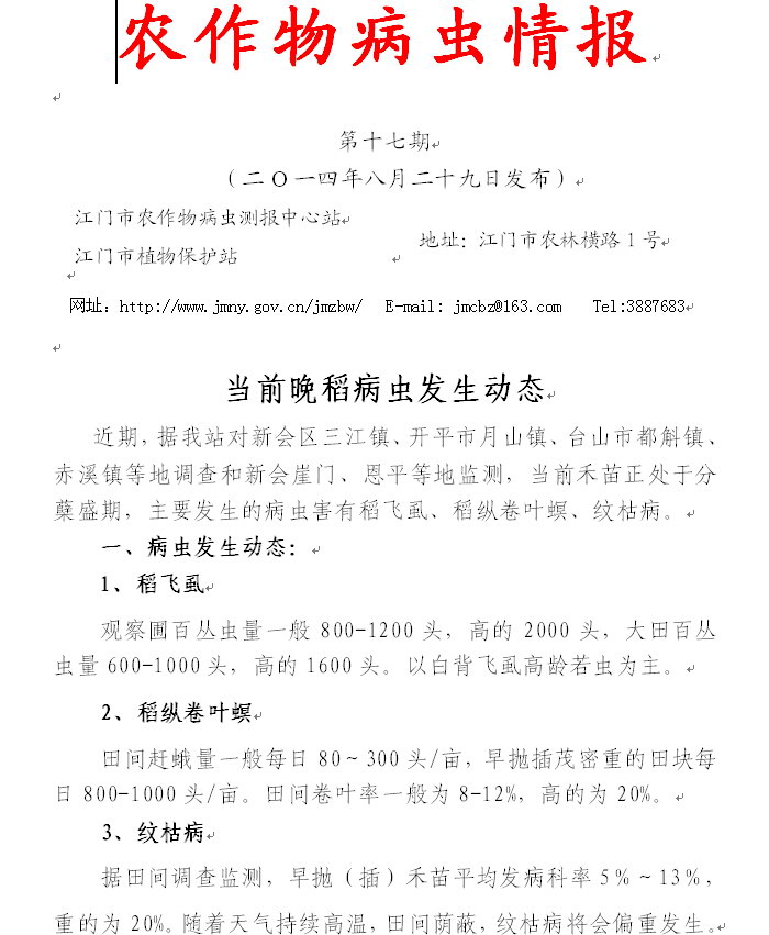 2014年农作物病虫情报第十七期(当前晚稻病虫发生动态)