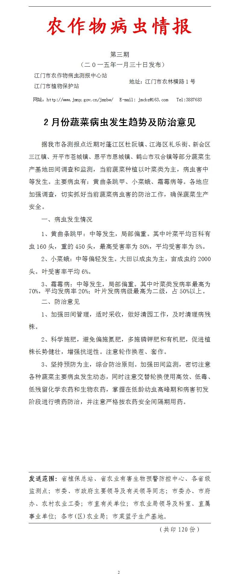 2015年农作物病虫情报第三期(2月份蔬菜病虫发生趋势及防治意见)