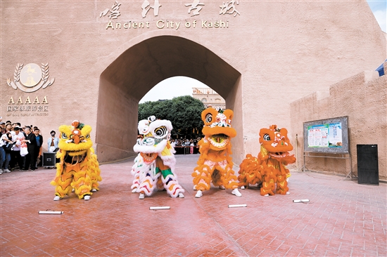 江门“小醒狮”亮相喀什古城。