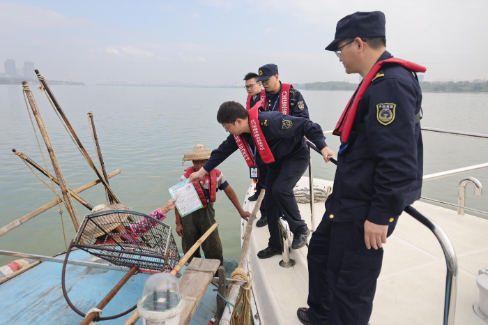 2月28日下午,市海洋综合执法支队支队长汪炳康带队在西江水域开展禁渔期前执法巡查,行动中共检查涉渔船舶1艘,并向从业人员派发禁渔宣传单张。