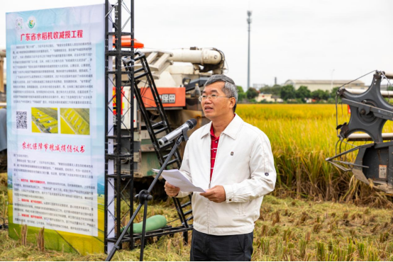 在大比武现场,来自台山市广海镇的参赛选手冯承志代表广大农机手同行们发出“规范作业,确保水稻颗粒归仓”“提高本领,减少机收损失”“加强自律,维护市场秩序”三点倡议,承诺带头树立农机手的良好形象,为保障国家的粮食安全贡献自己的力量。