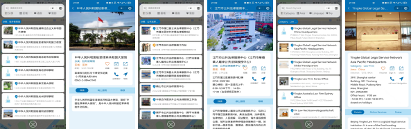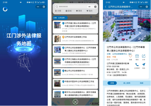 “江门涉外法律服务地图”是一款专业地图应用,通过现有的地图服务,将全球涉外法律服务资源进行有效整合。主要对与华侨华人联系紧密的驻外使领馆,涉外公共法律服务中心(站)、律师事务所、公证处等法律服务机构进行标注,添加情况介绍、联系方式、地址导航和线上服务链接。