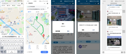 “江门涉外法律服务地图”小程序里面设有搜索、导航、收藏、互动、分享五种基本功能。