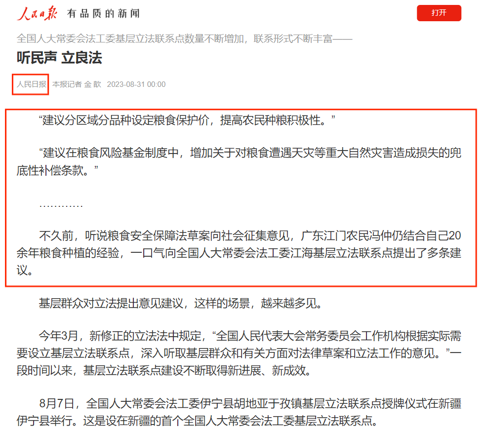立法意见建议的征集是联系点的一项重点工作。市司法局充分发挥政府立法基层联系点覆盖面广的优势,主动加强与全国人大常委会法工委江海基层联系点的联动对接,依托政府立法基层联系点,织密立法意见建议收集网,让更多市民参与国家立法,向国家最高立法机关传递侨都声音。政府立法基层联系点恩平市牛江镇人民政府作为农业大镇,在市司法局指导下,组织职能部门、种粮大户、粮食仓储加工企业代表、农业合作社代表、农技人才代表等为《中华人民共和国粮食安全保障法(草案)》积极建言献策,提出分区域分品种设定粮食保护价、增加对粮食遭遇天灾造成损失的兜底性补偿条款等建议。本次立法建议征集活动受到了多方关注,更被主流媒体《人民日报》《农民日报》、全国人大微信公众号、《中国人大》杂志等报道宣传。
