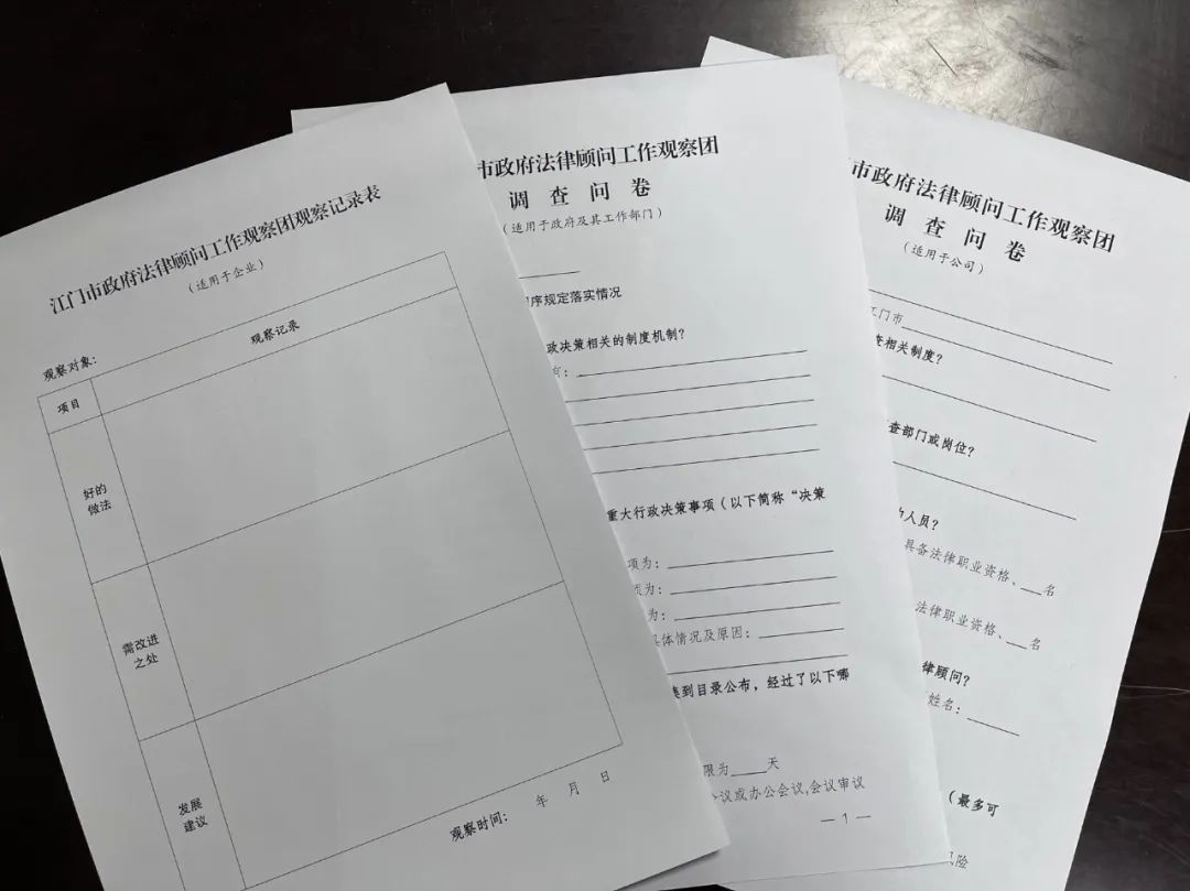 观察团由7名观察员组成,包括市政府法律顾问专家咨询委员会专家学者、五邑大学教授何荣华,市政府法律顾问周磊律师、郭凯莉律师以及市国资委、市工业和信息化局,蓬江区、台山市政府法律顾问室,恩平市东成镇政府法制工作人员。观察团通过问卷调查、清单调研、抽样观察、座谈访谈、观察点评等方式有针对性地对机关和企业开展观察。