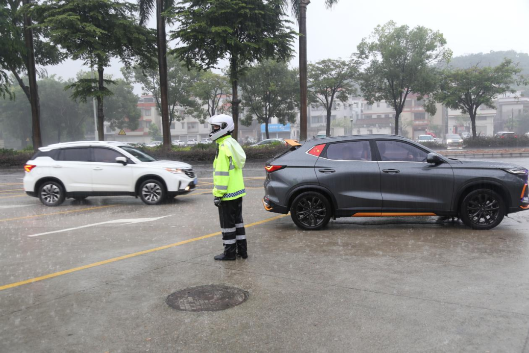 (图为公安交警在暴雨中指挥疏导校门前交通)