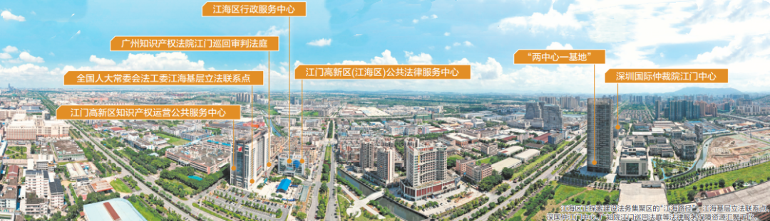 2019年12月,江门高新区知识产权运营公共服务中心正式揭牌;2020年7月,广东省首个“国字号”全国人大常委会法工委基层立法联系点落户江海;2021年11月,“两中心一基地”挂牌成立;2022年1月,广州知识产权法院江门诉讼服务处升级为广知院江门巡回法庭;2022年2月,江门高新区(江海区)公共法律服务中心完成升级改造;2023年5月,深圳国际仲裁院江门中心正式运营,全国首创区域仲裁合作新模式;新增律师事务所4家、意向落户1家,律所数量、律师数、律师万人比2022年底实现倍增;新增资产评估、会计机构各1家,以及调解、司法鉴定和公证等服务点4处;组建了“侨梦苑”涉侨纠纷化解中心和涉企法律服务中心……