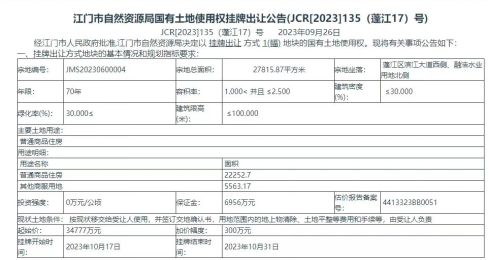 9月26日,位于蓬江区滨江大道西侧、融浩水业用地北侧的市本级政府储备地块正式挂牌出让,该地块建设用地面积约27815.87㎡(约合41.7亩),容积率最高2.5,建筑高度≤100米,地块起拍总价34777万元,折合楼面价约5001元/㎡,将于10月31日摘牌。