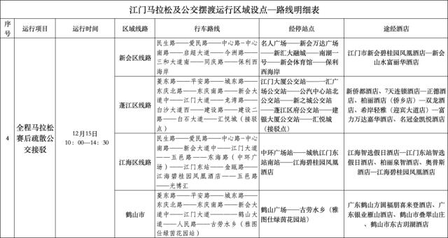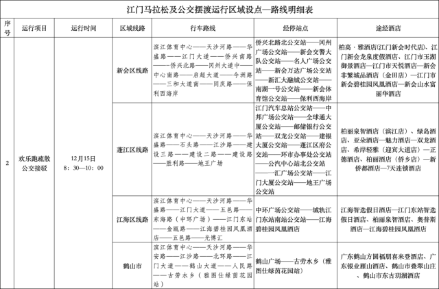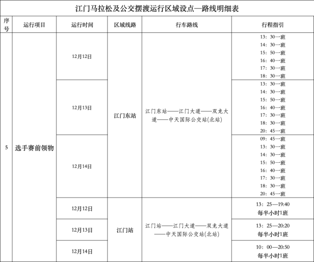 为方便外地跑友快捷顺利的到达五邑华侨广场领取参赛物资,组委会在2024年12月12日--12月14日特设置江门站、江门东站免费接驳车。