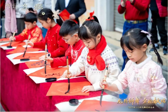 锣鼓喧天,在钓台故址还有萌娃送福。宣纸柔软,翰墨飘香,别看孩子们年纪小,一拿起笔却是无比专心认真,每一个字更是遒劲有力。一笔一画满载着童真童趣,传统文化在孩子们笔下充满无限可能。一时间,快门声此起彼伏,观众们连连感叹,”写得太好了!”“太棒了!”