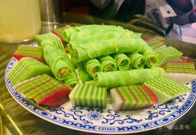 由椰丝和斑斓汁做成的斑斓卷,口感丰富又清新,先用斑斓叶榨汁后,加上面粉制成小薄饼,卷上用黄糖炒过的手剥椰丝就完成了。整体看上去翠绿可爱,吃起来甜而不腻,清新爽口。