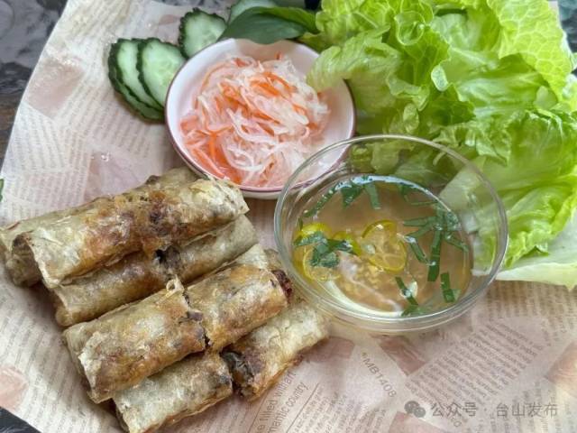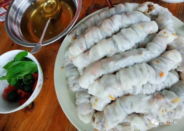 越南卷粉是以米粉和水磨碎后蒸制成的食品,里面可以根据个人的口味做成鸡蓉、鸡蛋、香菇、葱花、香菜等馅料,另外也可以抹上沙蟹汁、辣椒酱、酸甜酱等拌着吃,味道鲜美,口感润滑。