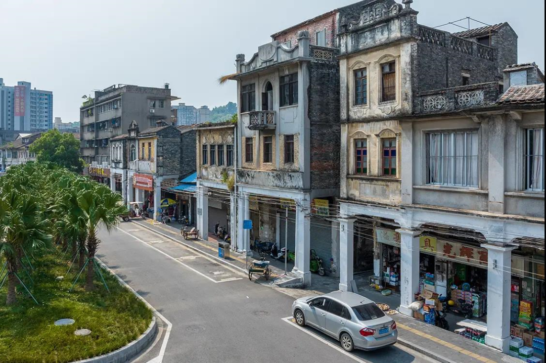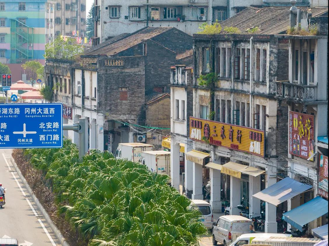 浐湾路沿街骑楼,位于会城冈州大道中原浐湾路段北侧。古书中“浐浐”指鱼群流水的样子。浐湾街,位于象山西南侧脚下,古时为大海,随着泥沙不断淤积,形成浅湾,常有鱼群游动。后这一带经过加高,陆续建起民房,人流开始聚集,形成了浐湾街。由于该地位于古城池西南外的交通要道,且临会城河水运便利,后逐步发展为繁华的集市,成为会城重要的物流集散地。