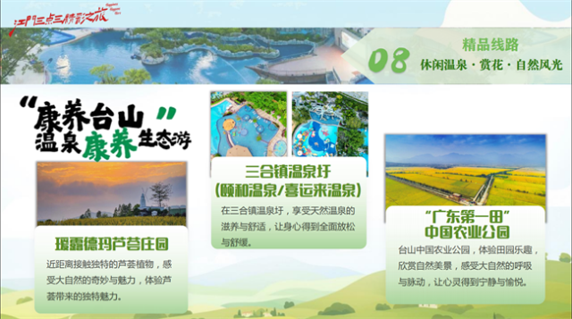这条线路集赏花、自然疗愈、温泉养生与生态漫游于一体。周末泡温泉,感受地热泉水的疗愈力,尽享台山慢生活的悠然韵味。
