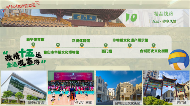 第十五届全国运动会举办在即,台山将承办排球(男子成年组)项目。承借这场盛大的体育赛事,为此我们设计的线路是侨乡观赛游,从新宁体育馆出发,到华侨文化博物馆、正贤体育馆、西门墟、非遗馆、台山历史文化街区,这条线路融合赛事激情与侨乡底蕴,邀您共赴一场活力与人文交织的深度之旅。