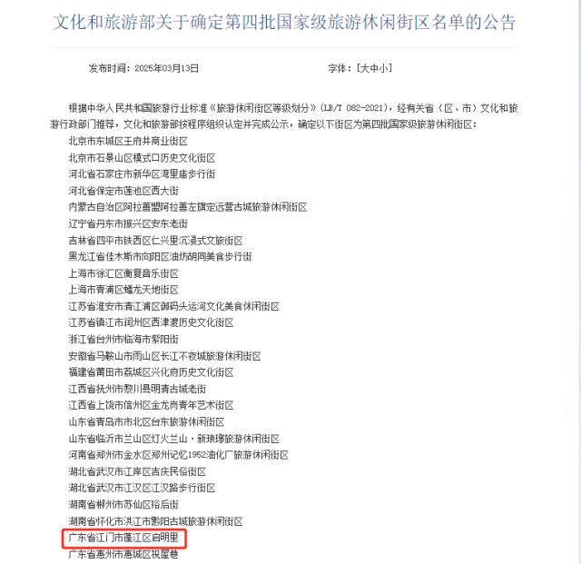 3月13日,文化和旅游部公布第四批国家级旅游休闲街区名单。其中,江门市蓬江区启明里上榜,成为广东入围公示名单的两个街区之一。