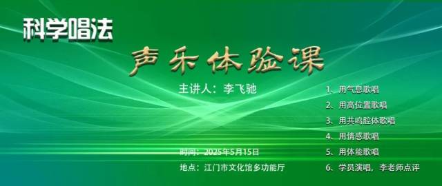 5月15日下午,一场别开生面的“科学唱法”声乐体验课在江门市文化馆二楼多功能厅举行。此次活动由江门市文化馆工会主办,吸引了来自文旅体系统的120余名工会会员及声乐爱好者参与。