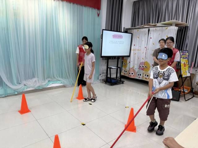 为深化理解,活动设置了“蒙眼迷宫”“蒙眼叠杯塔”两项沉浸式体验游戏。“蒙眼迷宫”中,两人一组戴着眼罩绕开雪糕筒障碍物,“蒙眼叠杯塔”则是三人在蒙眼状态下将10个杯子叠成4层塔。参与者在黑暗中摸索前行,依靠听觉交流与触觉感知完成任务,真切体会到视力障碍者的生活挑战。游戏过程中,普通学生与特殊学生默契配合,互相指引,在协作中打破隔阂,建立起信任与友谊。