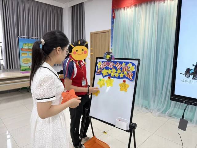 绘本故事后,老师引导孩子们思考:“小鼹鼠经历了温暖的一天,在写给奶奶的信里,它会写什么呢?”孩子们在星星形状的卡片上替小鼹鼠写下“给奶奶的信”,信里告知奶奶动物城并不可怕,它们都非常友好。