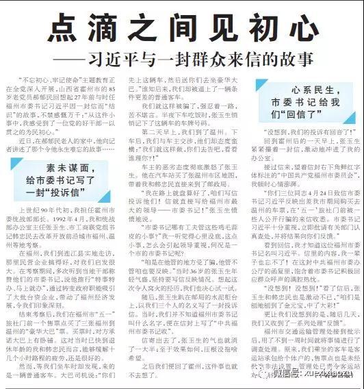 “不忘初心、牢记使命”主题教育正在全党深入开展,山西省霍州市的85岁老党员郝郁民回想起27年前与时任福州市委书记习近平因一封信而“结识”的故事,不禁感慨万千:“从这件小事中,我感受到了一位党的好干部一以贯之的为民初心。”