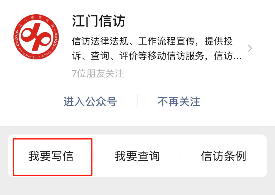 步骤一 点击进入江门信访公众号首页,点击下方“我要写信”进入“江门市网上信访投诉平台”。