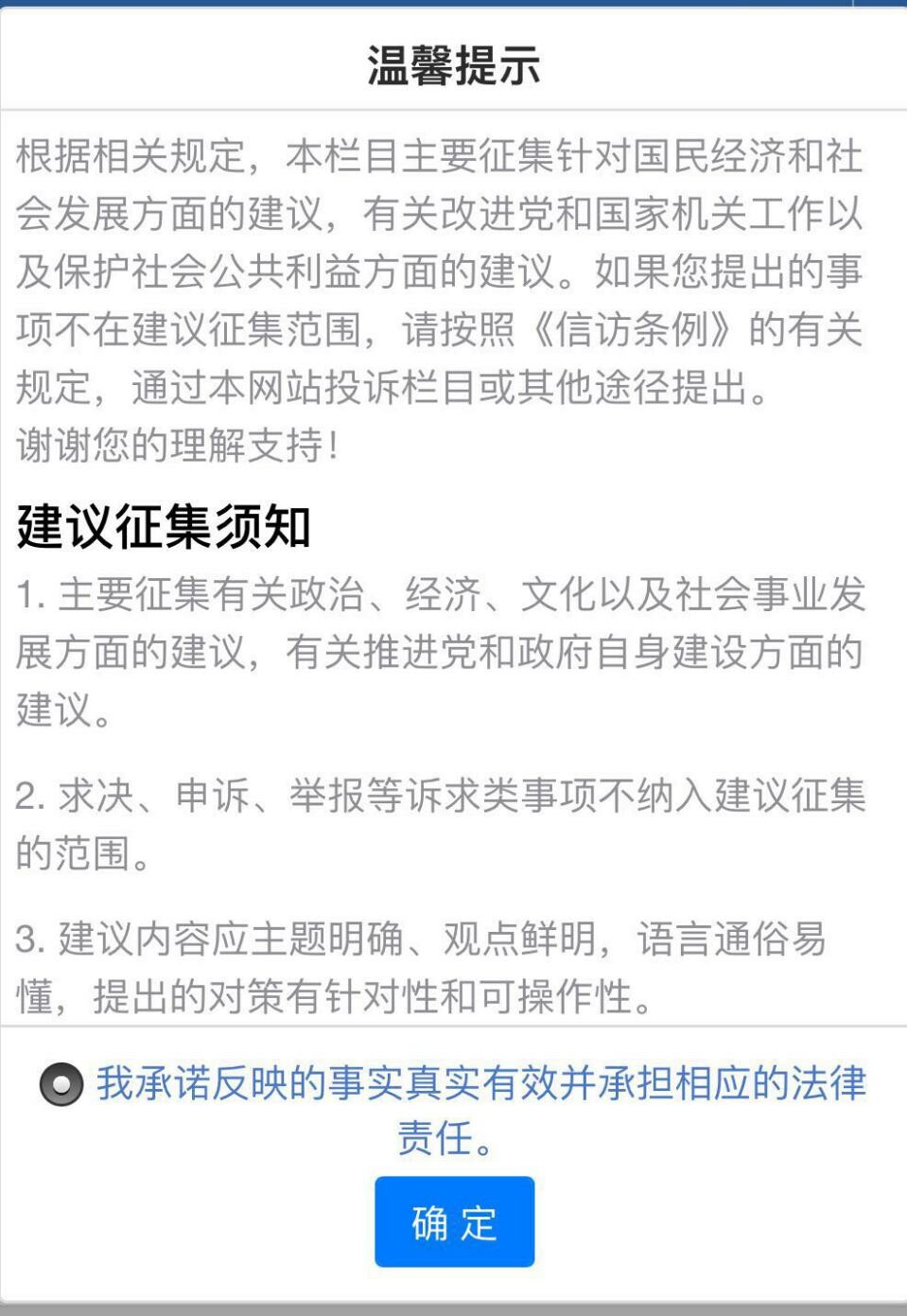 步骤五 ①如您选择“意见建议”,将进入“意见建议—温馨提示”页面,请您认真阅读温馨提示内容,选择“我承诺反映的事实真实有效并承担相应的法律责任”,点击“确认”。