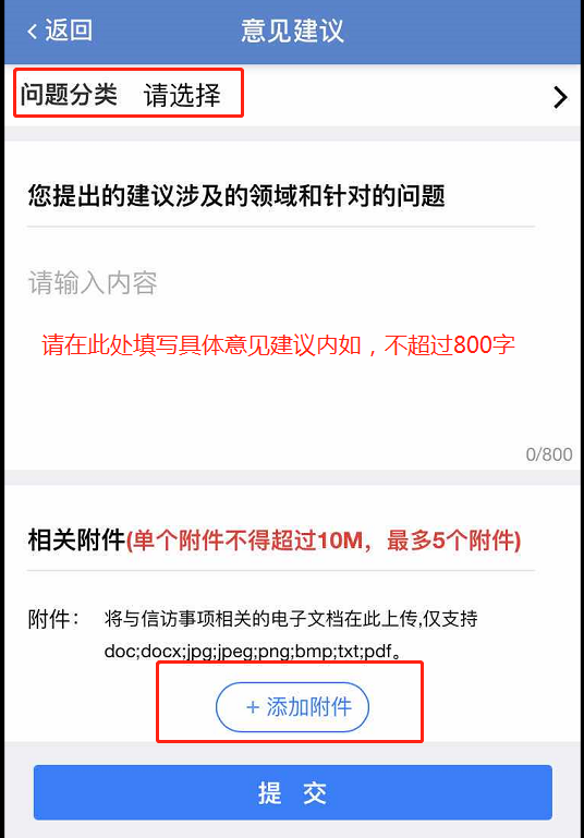 填写意见建议时,第一步选择“问题分类”,请您根据实际情况认真选择,这有利于我们准确甄别您的诉求,转交给有关部门及时处理;第二步在“您提出的建议涉及的领域和针对的问题”栏填写您需要反映的内容,内容填写不超过800字,如您反映的具体内容比较多,或者有图片等依据材料,您可选择“添加附件”,将有关依据添加到附件栏,此处单个附件不得超过10M,最多只能添加5个附件;第三步您填写完所有信息,确认无误后点击“提交”即可完成您的操作。