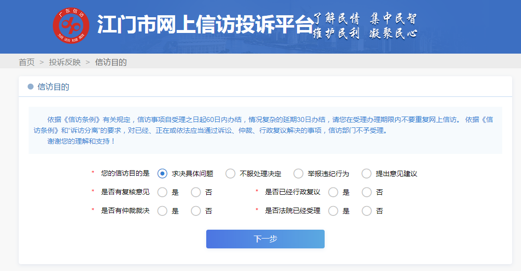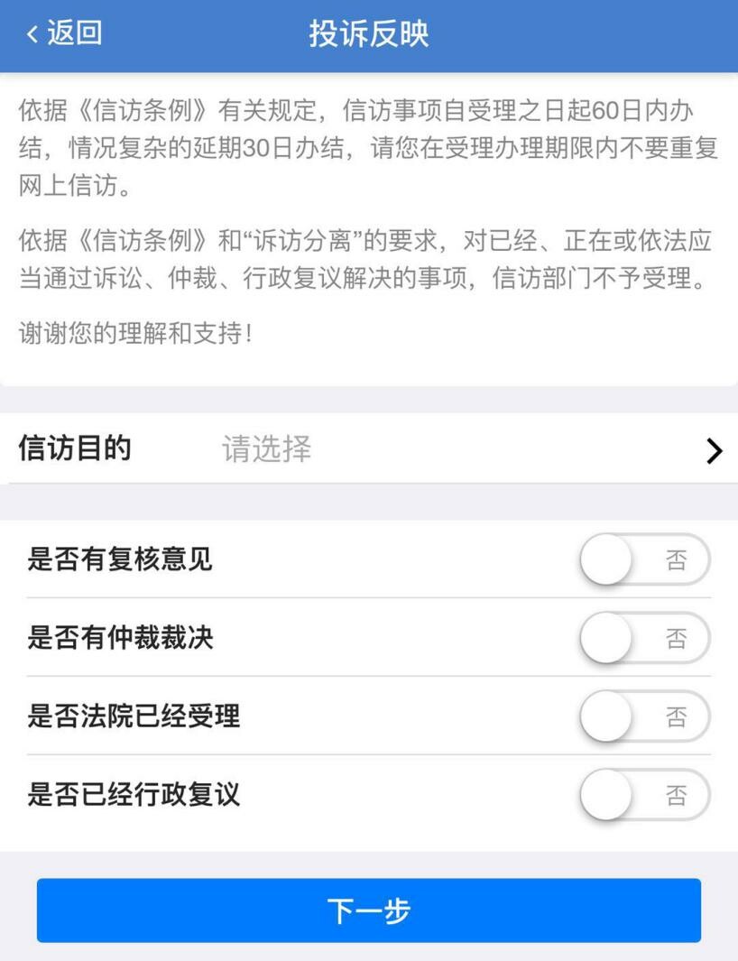 步骤五①当进入“我要投诉”页面,阅读相关提醒内容后,选择您的“信访目的”,并按您的诉求实际情况选择否有复查复核意见、是否有仲裁裁决、是否法院已受理、是否已行政复议等选项,这有利于工作人员对于您基本诉求的甄别,确保您的诉求能准确及时转交到有关部门。完成相关选项请点击“下一步”,进入“投诉请求”内容填写页